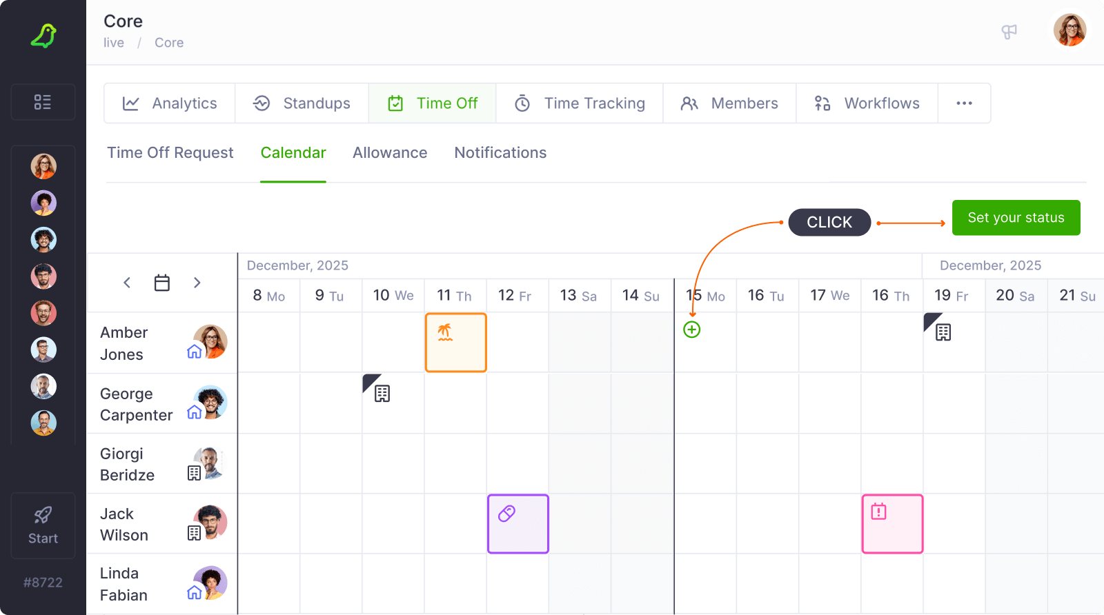 Teamplify includes a built-in time-off management system that seamlessly integrates with Team Analytics, Smart Standups, Time Tracking, and the rest of the platform’s features.