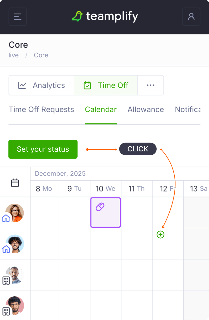 You can request time off from the Time off tab in your Teamplify profile or from the team calendar view. Either click the Set your status button, or hover on any day on the calendar and click the ⊕ icon: