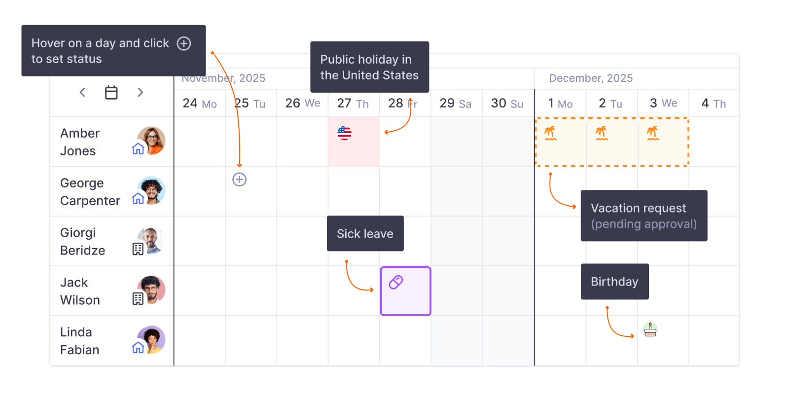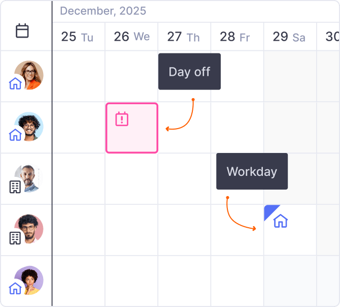 Teamplify calendars display your teammates’ availability, national holidays, and birthdays using colored icons: