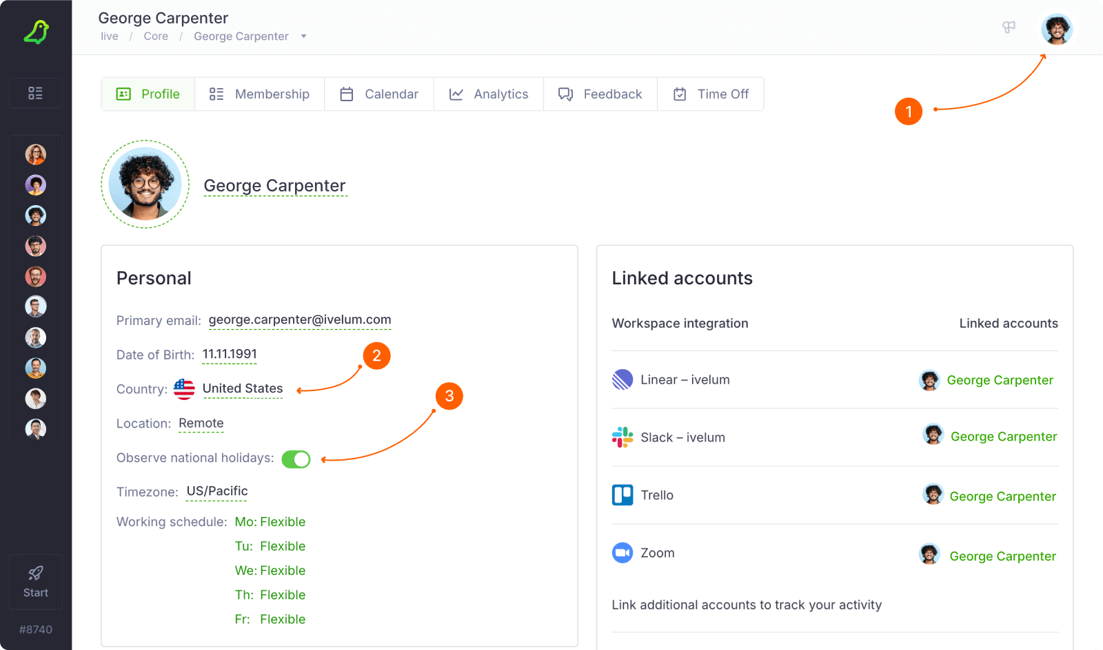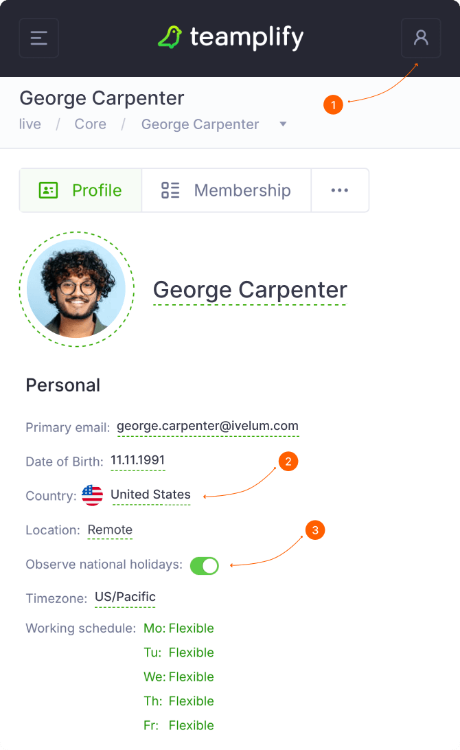 To ensure the correct holiday schedule applies to your team members, make sure each user has the appropriate country selected in their profile and verify that the Observe national holidays option is enabled.