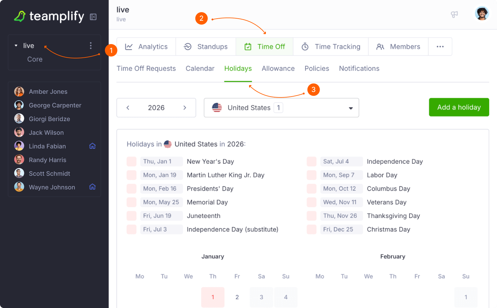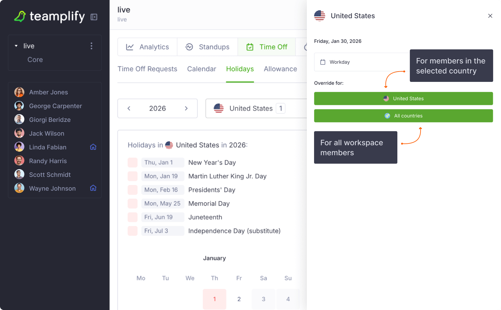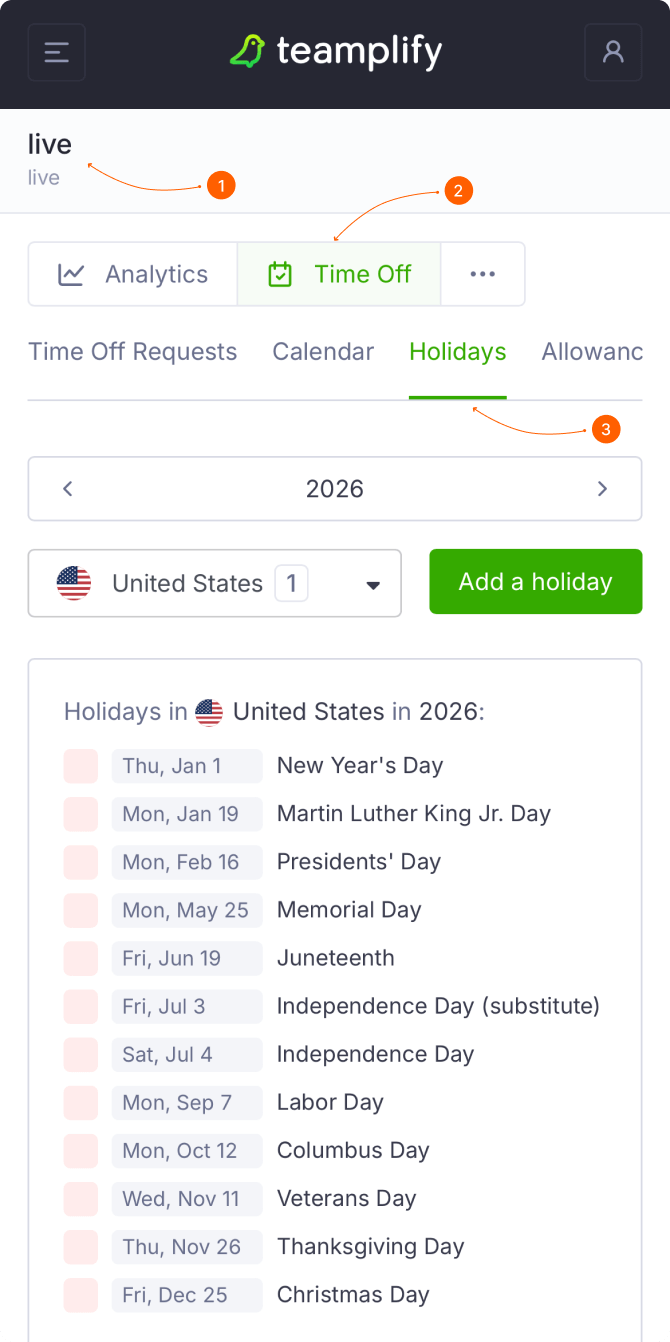 Teamplify includes a built-in national holiday schedule covering nearly all countries worldwide, which is updated automatically and regularly—no action required on your part.