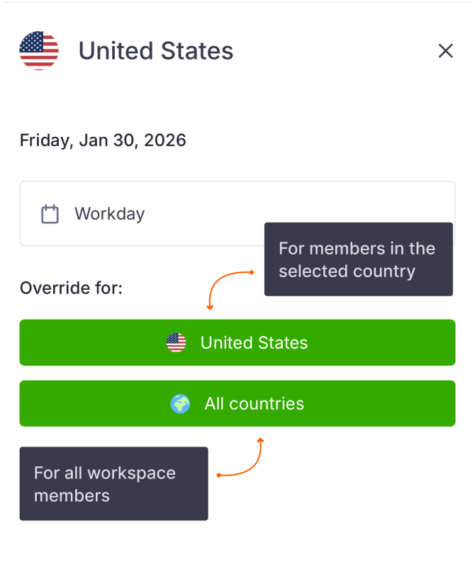 To add a custom holiday or working day, either click on the desired date or select Add a holiday and choose a date from the calendar. Then, decide whether the override should apply only to members in the selected country or to all workspace members regardless of location. Finally, choose the action—Force workday or Force non-working day—and provide a Description explaining the reason for the change.