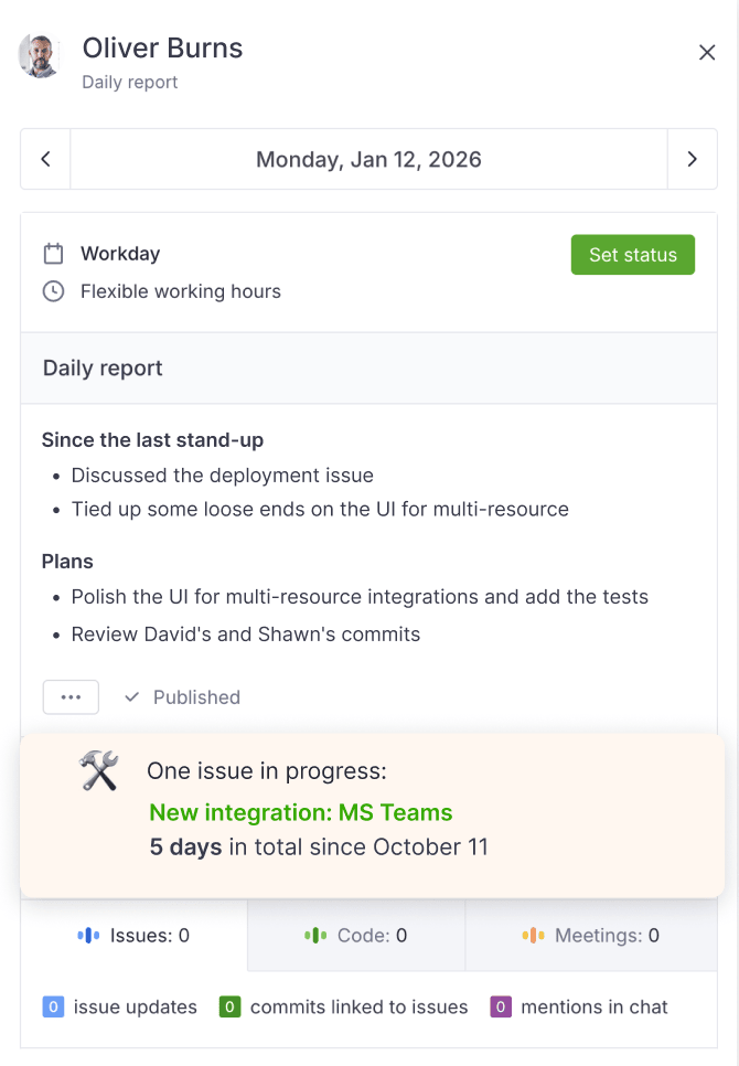 Teamplify only uses information that is already openly shared with the team: issue statuses, assignments, and work schedules. There is no tracking software to install on employees' computers.