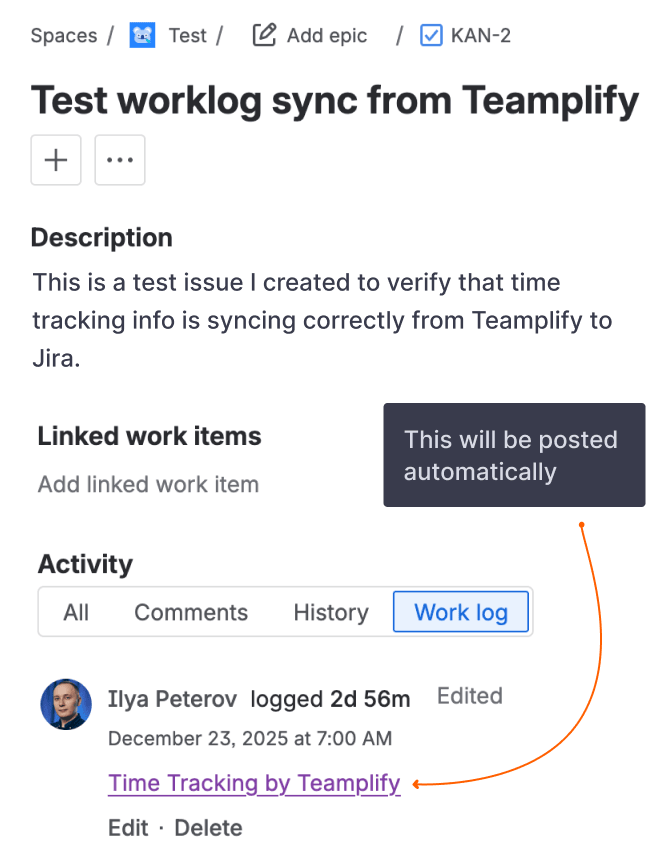 Teamplify adds a special comment to each worklog it creates: "Time Tracking by Teamplify". This marker tells Teamplify which worklogs it manages, so it knows what to update on subsequent syncs.