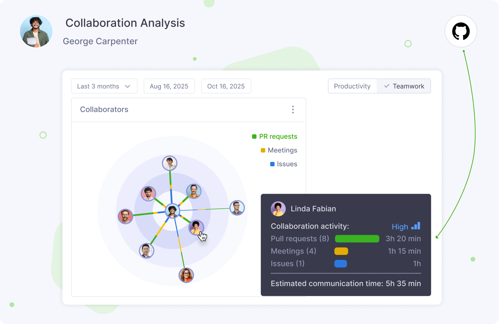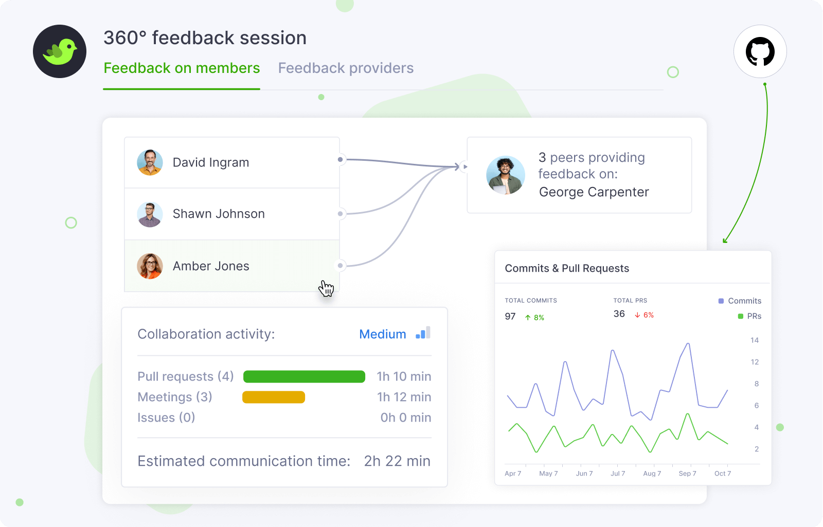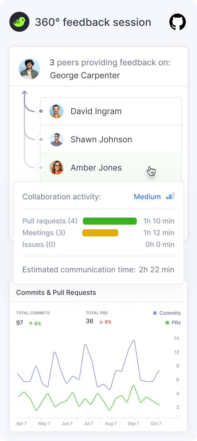 Teamplify's 360° feedback sessions become even more effective with GitHub data. By analyzing collaboration patterns in pull requests, Teamplify can provide more accurate automated suggestions for feedback peers.