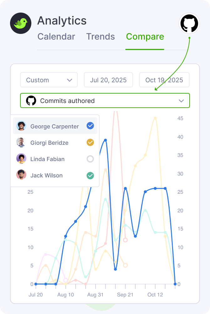 When giving or receiving feedback, human input is shown side-by-side with Team Analytics reports, offering a more comprehensive view of performance and helping reduce bias. Connecting GitHub not only enhances Team Analytics but also improves the quality and fairness of your 360° feedback sessions.