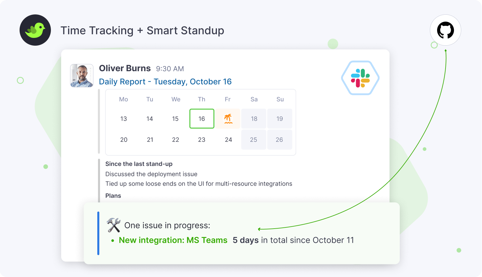 Team Workflows are integrated with Time Off, so the bot knows each teammate's schedule and won't disturb them during vacations or on national holidays.