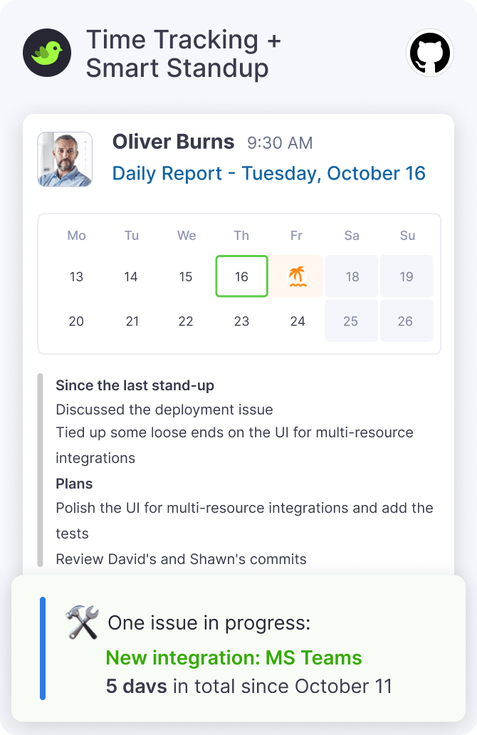Teamplify supports GitHub issues, so if you use GitHub as a task tracker, you can benefit from Effortless Time Tracking. This feature automatically logs time spent on each task by analyzing the task history and matching it with the work schedule.