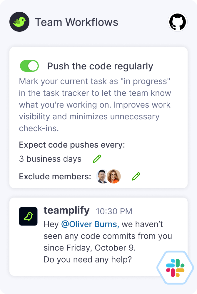 Configure the Teamplify bot to monitor specific events that may require a manager’s attention. Here's an example: