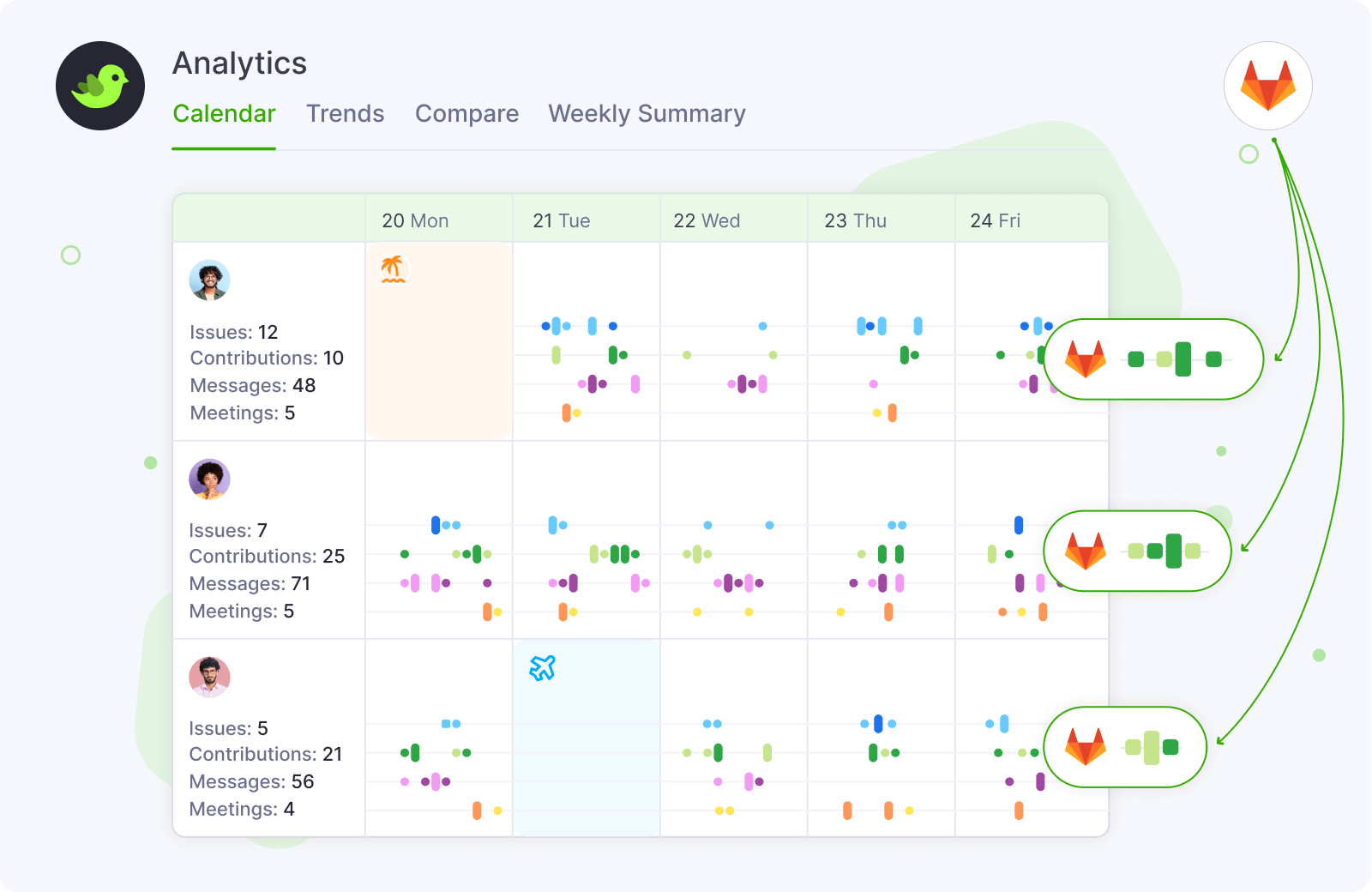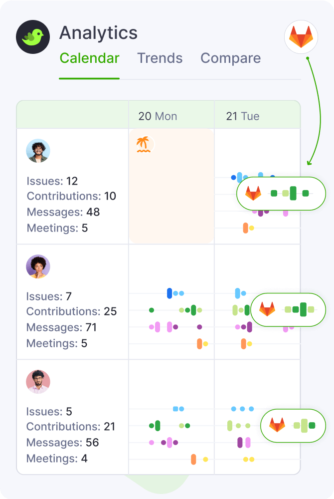 See how your team is working on code, merge requests, and GitLab issues through the Team Analytics dashboard. You can explore multiple views, including the Team Calendar, Trends, Compare, and Collaboration Analysis.