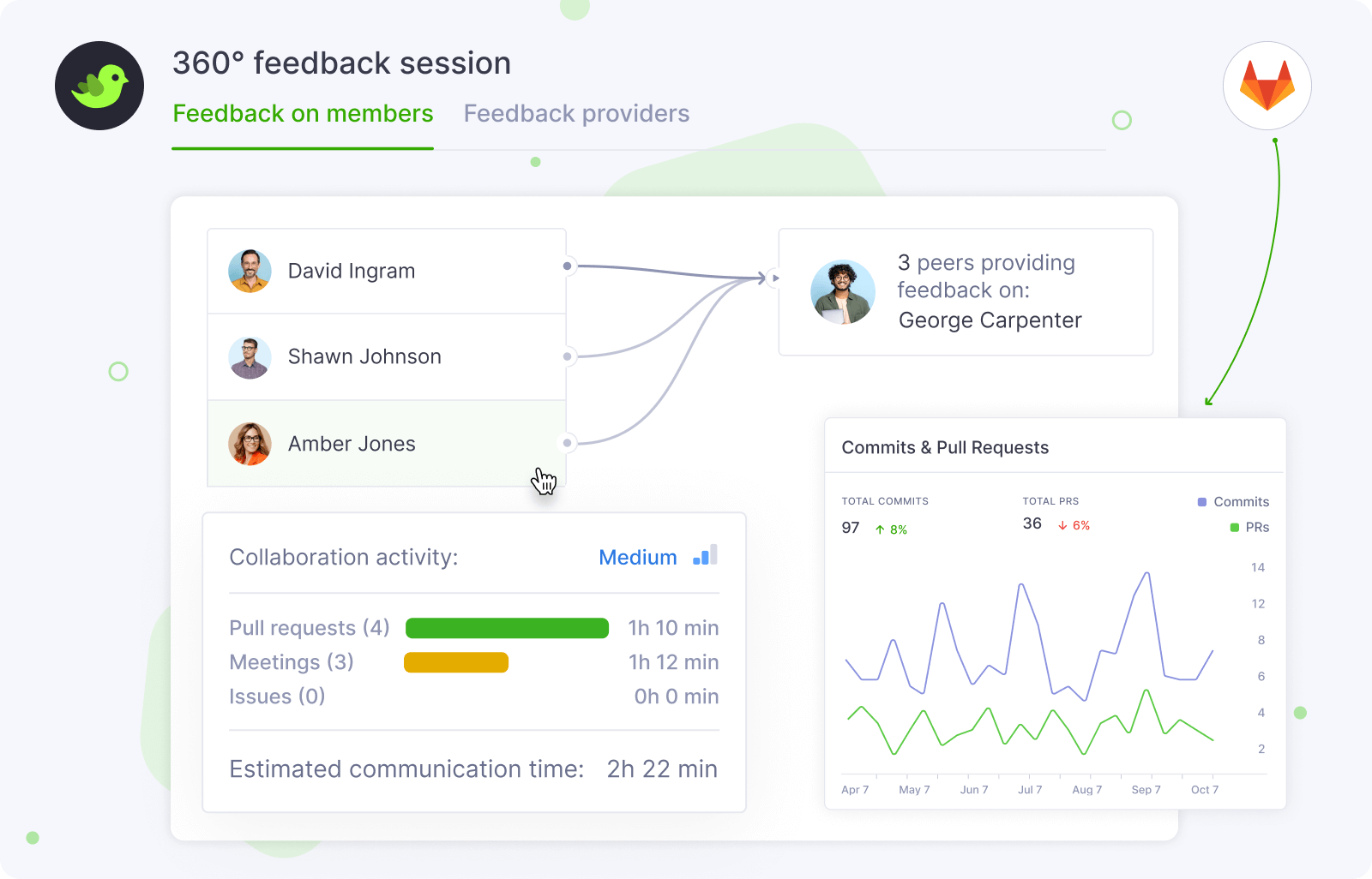 When giving or receiving feedback, human input is shown side-by-side with Team Analytics reports, offering a more comprehensive view of performance and helping reduce bias. Connecting GitLab not only enhances Team Analytics but also improves the quality and fairness of your 360° feedback sessions.