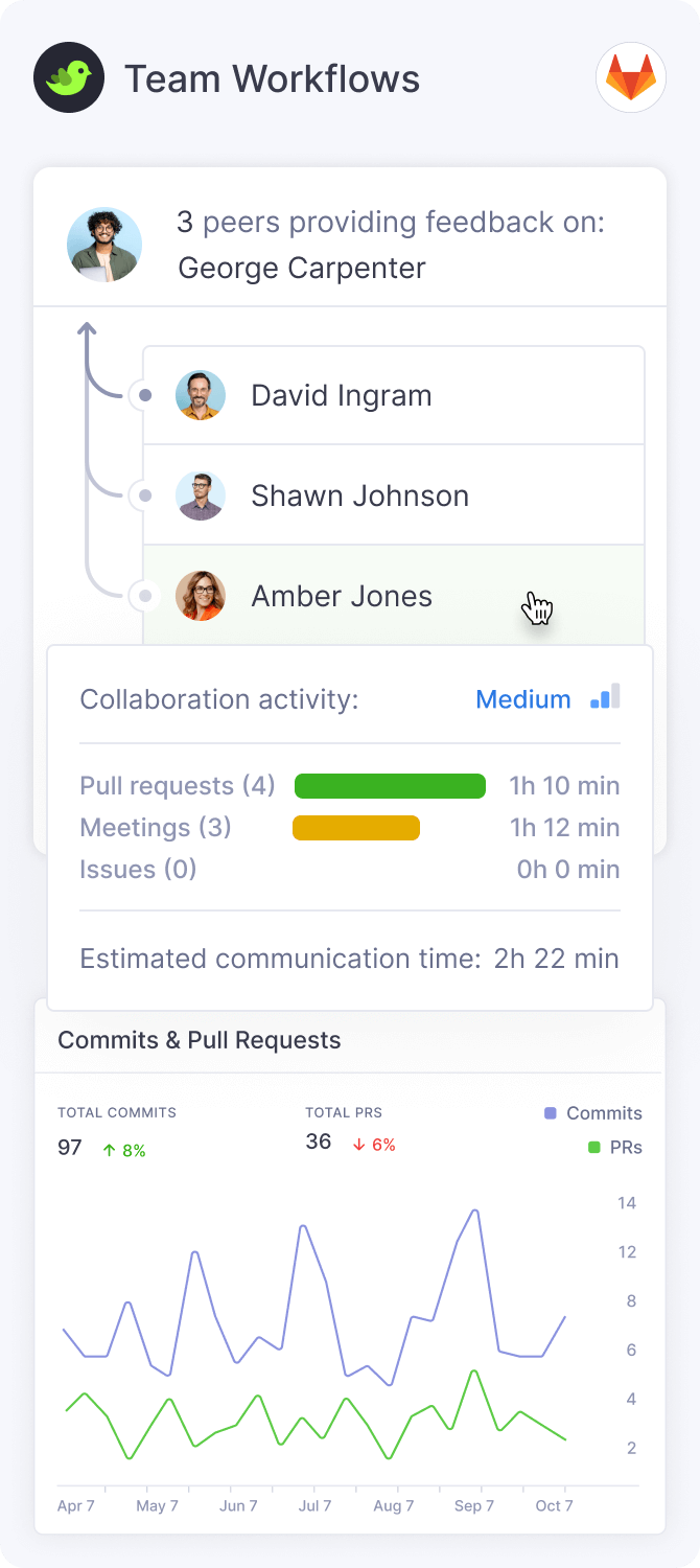 Teamplify's 360° feedback sessions become even more effective with GitLab data. By analyzing collaboration patterns in merge requests, Teamplify can provide more accurate automated suggestions for feedback peers.