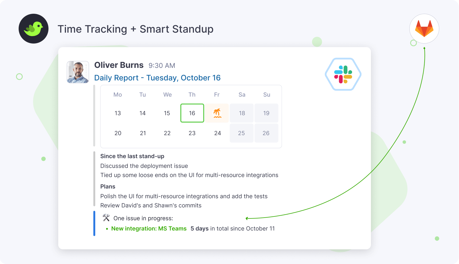 If you're using GitLab issues or any other supported task tracker, you may also benefit from workflows like Have a task in progress, Provide task updates, Due Dates, and more.