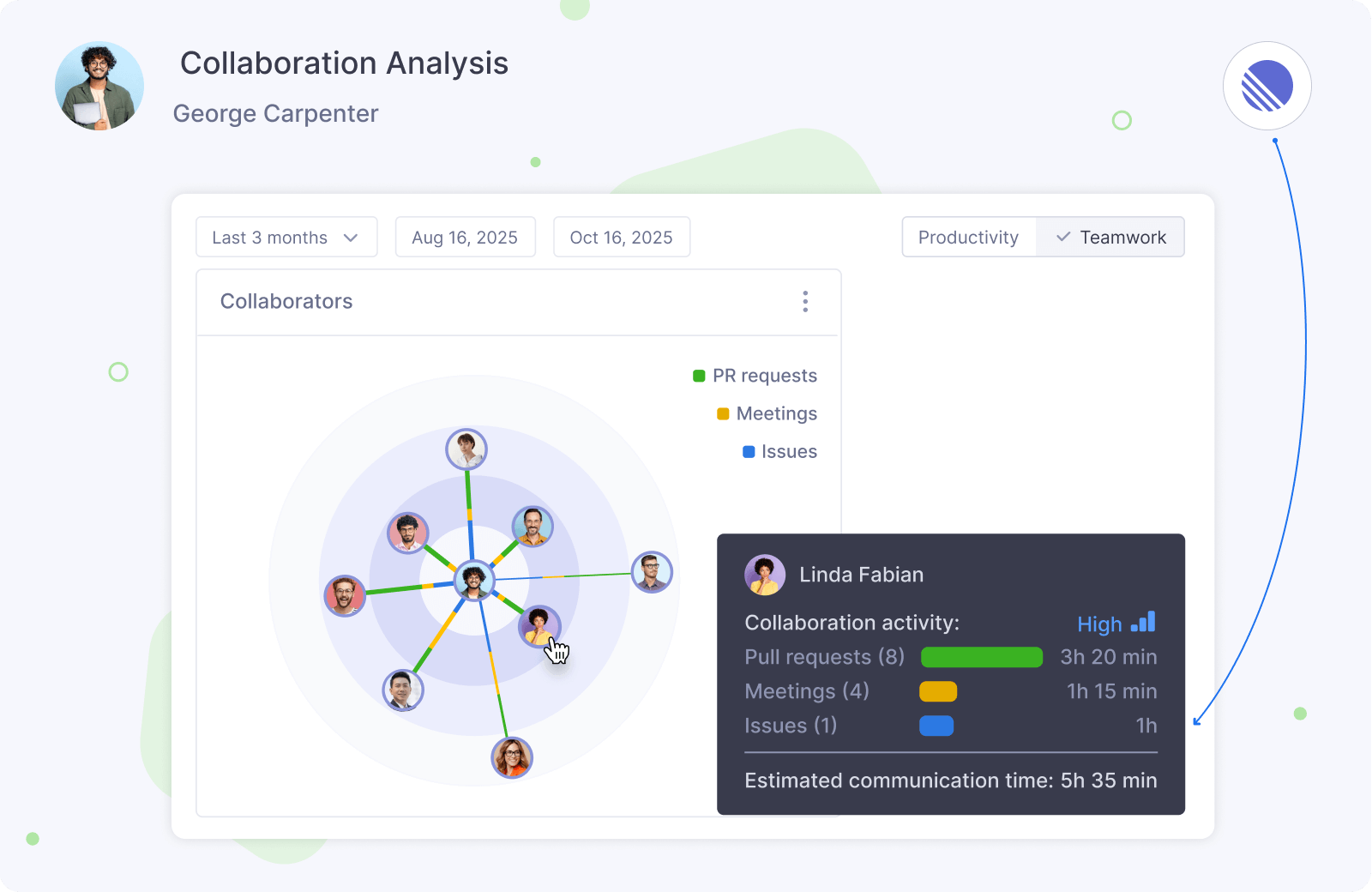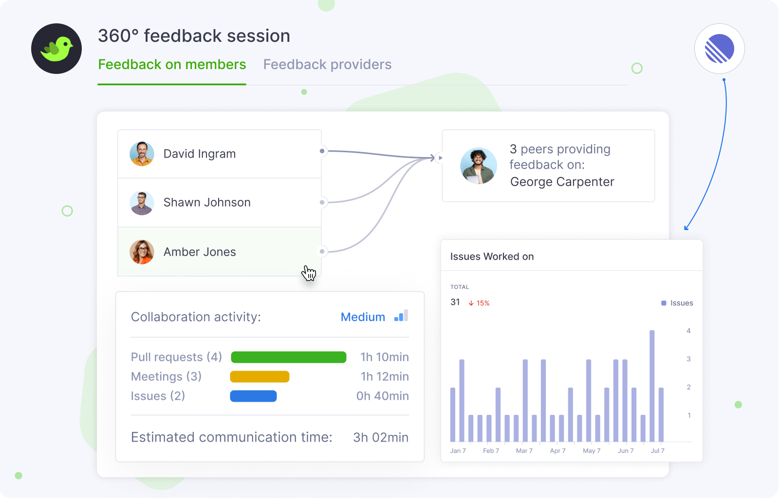 Teamplify's 360° feedback sessions become even more effective with Linear data. By analyzing collaboration patterns in Linear issues, Teamplify can provide more accurate automated suggestions for feedback peers.