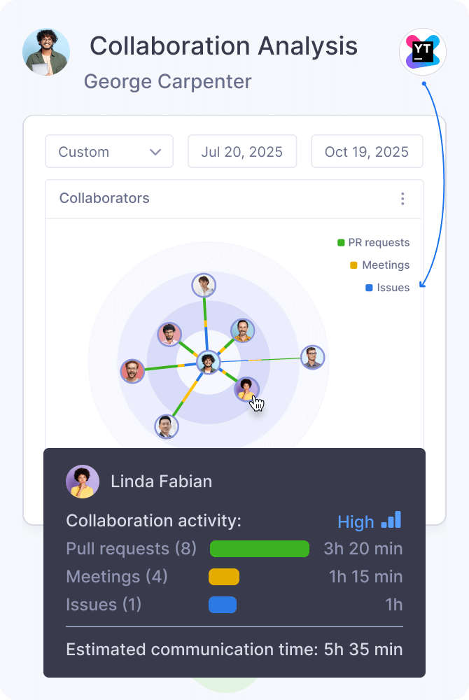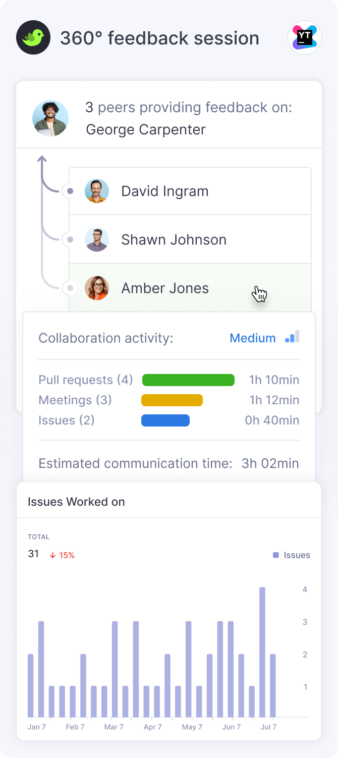 Teamplify's 360° feedback sessions become even more effective with YouTrack data. By analyzing collaboration patterns in YouTrack issues, Teamplify can provide more accurate automated suggestions for feedback peers.