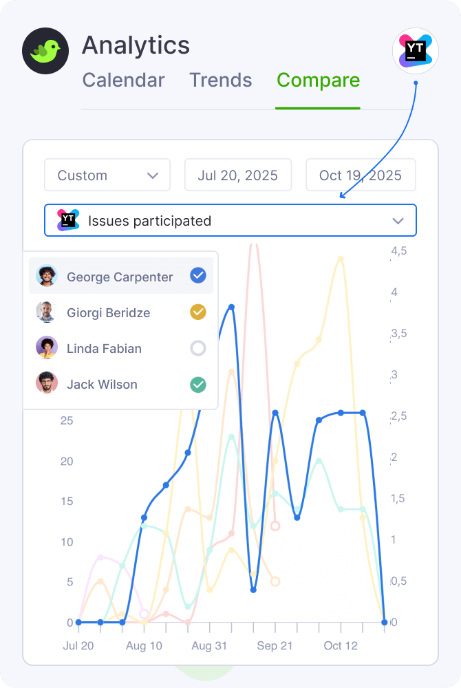 See how your team is working on YouTrack issues through the Team Analytics dashboard. You can explore multiple views, including the Team Calendar, Trends, Compare, and Collaboration Analysis.