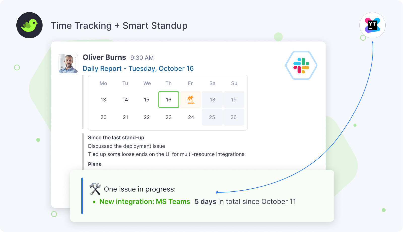 Team Workflows are integrated with Time Off, so the bot knows each teammate's schedule and won't disturb them during vacations or on national holidays.