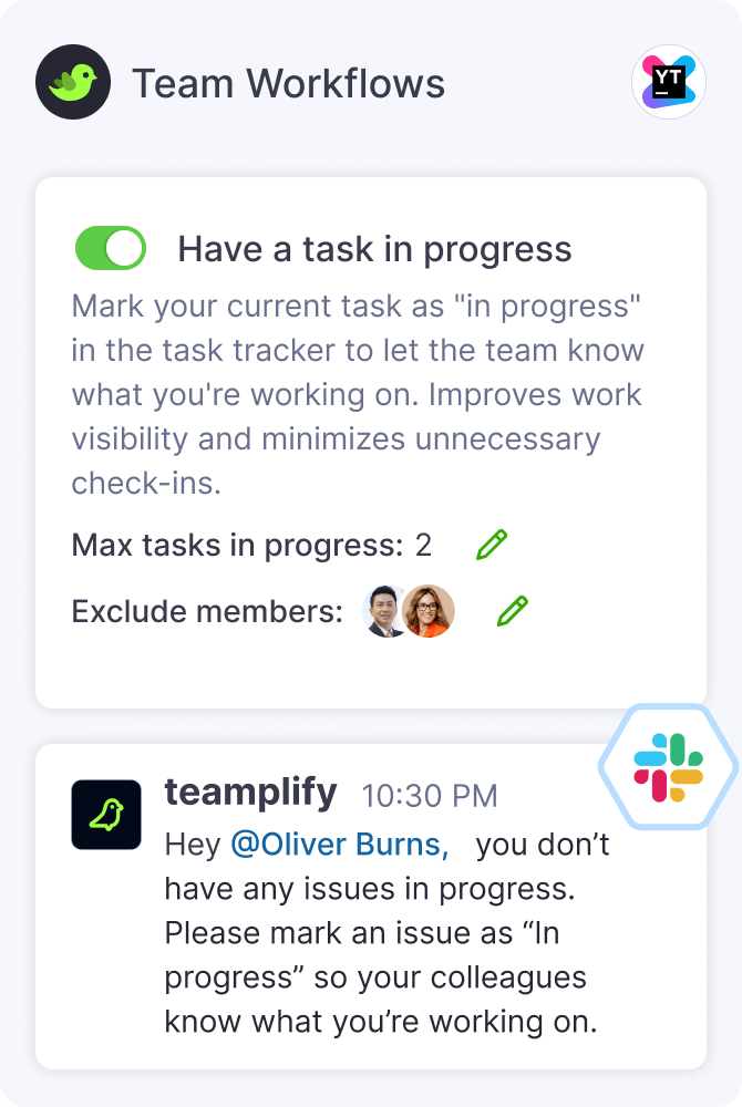 In addition to this one, Teamplify offers a variety of other workflows, such as Provide task updates, Push the code regularly (for developers), and others.