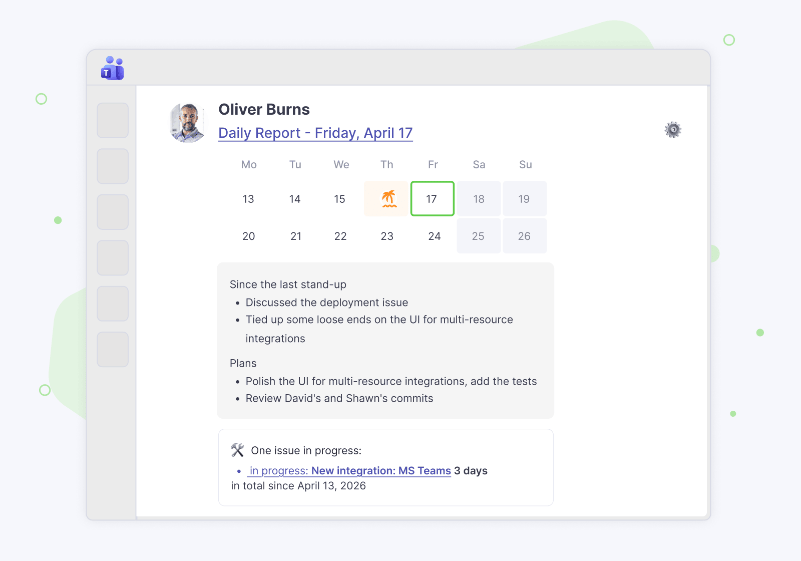 Meeting time is precious. Teamplify replaces routine status updates with async written standups, automatically detects stalled tasks, and sends smart reminders and reports — all directly in Microsoft Teams, so your team stays in sync without the meeting overhead.